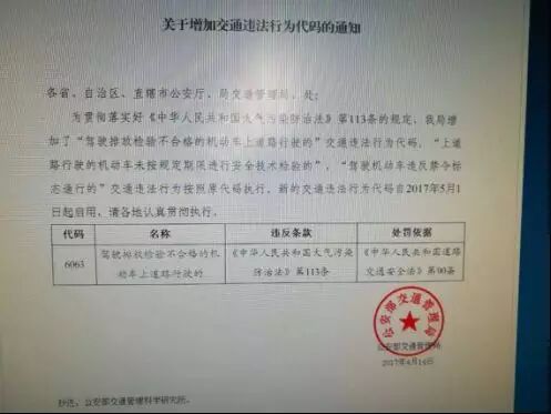 近日,公安部交通管理局向全國下發(fā)了《關(guān)于增加交通違法行為代碼的通知》(以下簡稱《通知》),《通知》指出,為貫徹落實《中華人民共和國大氣污染防治法》第113條規(guī)定,公安部交通管理局增加了“駕駛排放不合格的機動車上道路行駛的”交通違法行為代碼?!吧系缆沸旭偟臋C動車未按規(guī)定期限進行安全技術(shù)檢驗的”、“駕駛機動車違反禁令標志通行的”交通違法行為按照原代碼執(zhí)行。新的交通違法行為代碼自2017年5月1日起啟用。