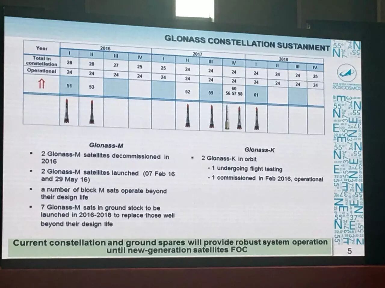 還有GLONASS—K的衛(wèi)星,現(xiàn)在我們有2顆在軌的衛(wèi)星,其中1顆正在進行飛行測試,另外1顆正在進行正常的運行?,F(xiàn)在如果我們看一下在軌的情況,我們是可以保證GLONASS的正常運行,當然在GLONASS—K的兩顆衛(wèi)星都能夠完全運行之前,我們可以利用整個現(xiàn)有系統(tǒng)保證正常運行。而且也會引入控制指令以及定軌相關的先進技術,而且也是基于不同的無線電的頻率,包括它的衛(wèi)星星力的數(shù)據(jù),以及原子鐘的更新,交叉鏈路的技術,來得到進一步的增強。