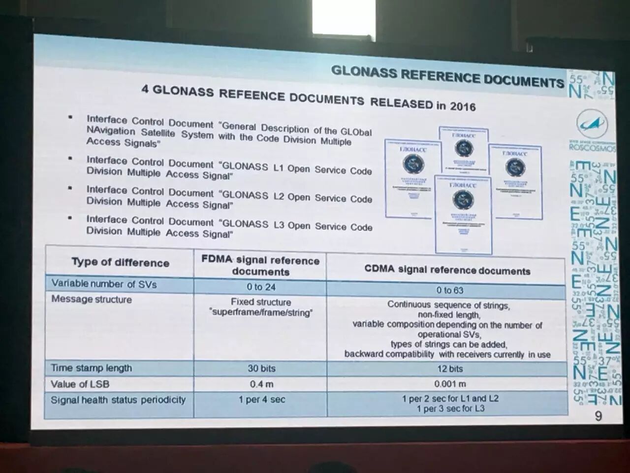 從去年年底到今年開始,已經(jīng)有4本GLONASS的參考文件得到正式發(fā)布,包括我們網(wǎng)站上這四個ICD文件,今年第二季度也發(fā)布了一系列的新的文件,這其中包括全球衛(wèi)星導航系統(tǒng)的CDMA信號相關的總體描述ICD文件,也包括GLONASS L1以及L2、L3開放服務CDMA信號相關的ICD的文件,而且也列出了其他的一些處理導航技術文件的算法。在這里也分別列出了包括GLONASS FDMA信號參考文件,包括其他的一些架構,也是CDMA的信號參考文件。