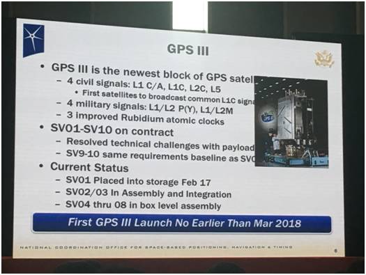 GPS衛(wèi)星目前已更新到了GPSIII。它有4個民用的信號(L1 C/A、L1C、L2C和L5)。廣播信號最常見的就是L1C信號,另外我們采用了3顆經(jīng)過改良的銣原子鐘。SV01衛(wèi)星現(xiàn)在已經(jīng)解決的最大問題就是載荷,上周我們已經(jīng)完成了在工廠中的組裝工作以及之后的測試工作,它已經(jīng)在2月17日下線入庫。另外SV02衛(wèi)星和SV03衛(wèi)星的組裝和整合工作已經(jīng)完成。SV04衛(wèi)星也已經(jīng)完成了機箱級組裝。SV的4顆衛(wèi)星的生產(chǎn)工作已經(jīng)全面完成了,它們將會在明年的3月份慢慢進入到發(fā)射過程。