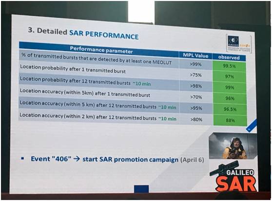 上圖展示了SAR具體的表現(xiàn),在搜救方面能夠提供更加精確的服務,搜救時間從過去的3小時減少到了現(xiàn)在的10分鐘以下。而且它的精度也有所提高,它從過去的10公里減少到5公里,發(fā)展到現(xiàn)在的2公里范圍內(nèi),同時在12月份我們也已經(jīng)發(fā)現(xiàn)使用伽利略的天基服務來獲取搜救信號這樣的例子。而且已經(jīng)有衛(wèi)星理事會采用這樣的方法,因為它有非常高的精度。同時在時間和位置方面,搜救信號確定可以在10分鐘以內(nèi)進行確定,也可以實現(xiàn)在衛(wèi)星搜救方面小于20分鐘的搜救信號發(fā)現(xiàn)時間。