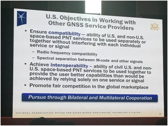 除在星座現(xiàn)代化之外,我們還進行一些其它服務。我們和國際的合作伙伴共同努力,促進衛(wèi)星和衛(wèi)星系統(tǒng)之間的兼容性。美國的GPS和其它的GNSS的系統(tǒng)可以單獨使用,也可以共同使用,互相之間并沒有信號的干擾。另外我們還考量一個問題,就是互操作性,美國的民用能力和非美國的天基PNT服務可以共同使用,以為客戶提供比單獨依賴一種信號或者服務更高的性能。所以我們會希望通過像雙邊以及多邊的合作,來實現(xiàn)兼容性和互操作性的發(fā)展。