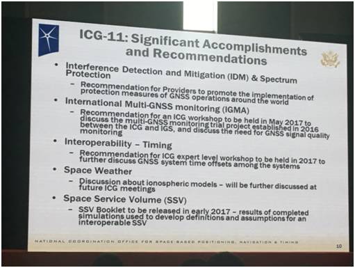 ICG第11次的會議于去年召開。另外我們也進行了在保護策略方面的實施工作,包括GNSS的運行,以及在全球范圍內(nèi)的全面保護。同時我們的ICG的座談會也即將召開,座談會將會進行信號監(jiān)控方面的研究,同時ICG和IGS之間也將建立相關的工作組。此外,還有在空間氣象方面的合作。我們也參與了昨日在上海召開的IGMA會議,我們希望減少在空間信號方面的誤差,同時也希望服務的總量可以進一步的提高。因此,在這方面,我們需要全球的合作伙伴共同努力,包括在中國的合作伙伴,以促進服務質(zhì)量的進一步提高?,F(xiàn)在民用的GPS服務不斷和其它GNSS系統(tǒng)供應商開展合作,在兼容性、互操作性以及透明度方面也獲得進一步的發(fā)展,GPS的性能已得到了進一步的提升,并且一直處于向公眾承諾的標準之上。此外,GPS現(xiàn)代化進程也將進一步加快。美國積極參與ICG活動,將進一步促進GNSS系統(tǒng)及其民用服務的提供,希望能使全球的用戶獲得更大的益處。