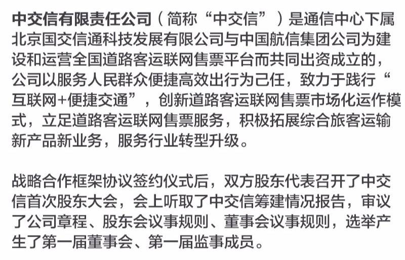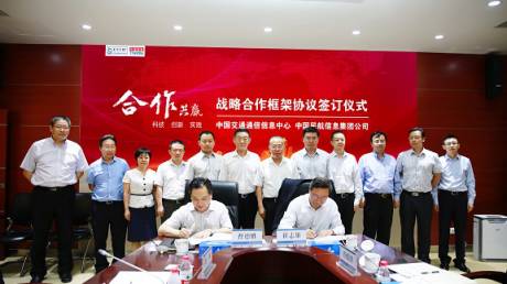 2017年6月,中國交通通信信息中心與中國民航信息集團公司在北京國際移動衛(wèi)星地面站簽署戰(zhàn)略合作框架協(xié)議,簽約儀式后,雙方股東召開了合資公司中交信有限責任公司首次股東大會暨首屆董事會。