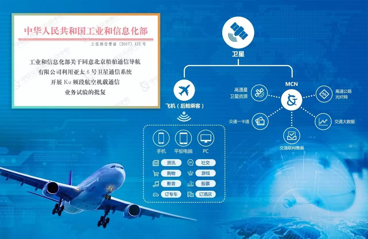2016年3月7日,通信信息中心獲得了工業(yè)和信息化部頒發(fā)的國(guó)家基礎(chǔ)電信業(yè)務(wù)經(jīng)營(yíng)許可證,成為基礎(chǔ)電信運(yùn)營(yíng)商。今年3月份,工信部正式簽發(fā)《工業(yè)和信息化部關(guān)于同意北京船舶通信導(dǎo)航有限公司(MCN)利用亞太6號(hào)衛(wèi)星通信系統(tǒng)開展Ku頻段航空機(jī)載通信業(yè)務(wù)試驗(yàn)的批復(fù)》。該批復(fù)標(biāo)志著MCN作為中國(guó)交通通信信息中心下屬企業(yè),也是唯一隸屬于交通運(yùn)輸部的國(guó)家基礎(chǔ)電信運(yùn)營(yíng)商,具備了在試驗(yàn)期內(nèi)利用Ku頻段衛(wèi)星寬帶鏈路,為飛機(jī)后艙旅客提供寬帶互聯(lián)網(wǎng)通信服務(wù)的資質(zhì)。