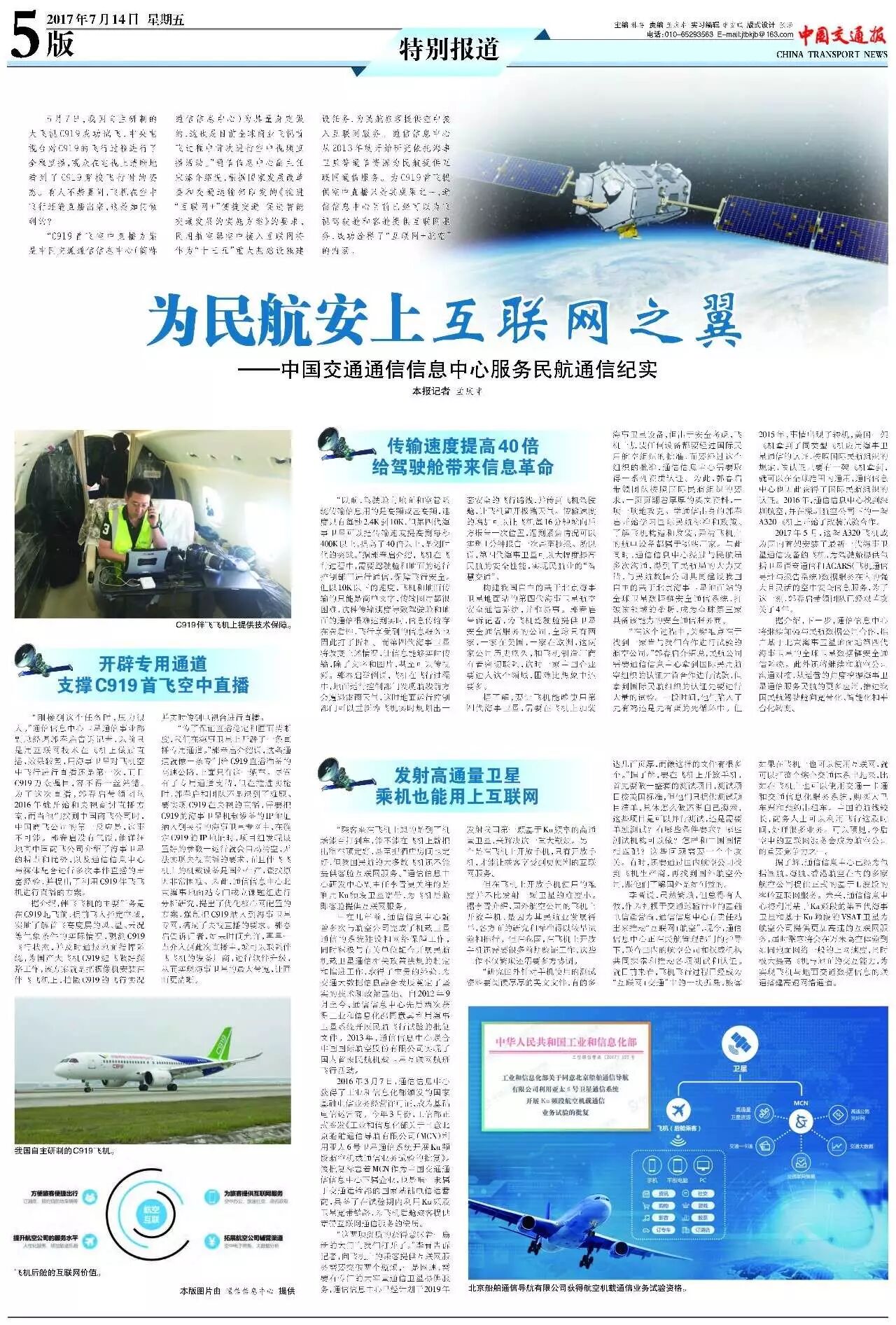“C919首飛空中直播方案是中國(guó)交通通信信息中心(簡(jiǎn)稱通信信息中心)為其量身定做的,這也是目前全球商業(yè)飛機(jī)首飛過程中首次進(jìn)行空中視頻直播活動(dòng)。”通信信息中心副主任宋溱介紹說,根據(jù)國(guó)家發(fā)展改革委和交通運(yùn)輸部印發(fā)的《推進(jìn)“互聯(lián)網(wǎng)+”便捷交通 促進(jìn)智能交通發(fā)展的實(shí)施方案》的要求,民用航空器空中接入互聯(lián)網(wǎng)將作為“十三五”重大基礎(chǔ)設(shè)施建設(shè)任務(wù),為民航旅客提供空中接入互聯(lián)網(wǎng)服務(wù)。通信信息中心從2013年就開始研究依托海事衛(wèi)星等通信資源為民航提供互聯(lián)網(wǎng)通信服務(wù)。為C919首飛提供空中直播只是其成果之一,通信信息中心目前已經(jīng)可以為飛機(jī)駕駛艙和客艙提供互聯(lián)網(wǎng)服務(wù),成功詮釋了“互聯(lián)網(wǎng)+航空”的內(nèi)涵。